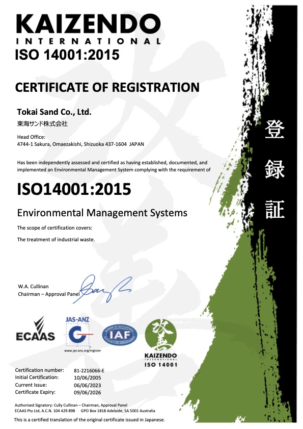 | 営業品目 | 遠州砂、レジンコーテッドサンド、国内産各種硅砂、輸入硅砂、各種再生砂、ガス型混練砂、鋳物用資材、ろ過砂利、ベトナム産アンスラサイト、スポーツサンド、緑化・植栽用製品、土木・建設業、解体業、建材用プレミックス、産業廃棄物収集・運搬業、中間処分業、高炉用除滓材製造 |